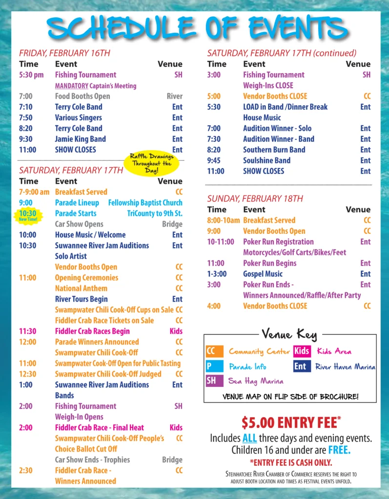 10th Annual Fiddler Crab T-Shirts will be available at River Haven, Sea Hag, Good Times, and Anchor Trust Realty. Also available at the Chamber office (Wed & Thurs) for sales as well. Chamber office will also be open starting Monday, Feb 12, 9-5 daily thru festival.